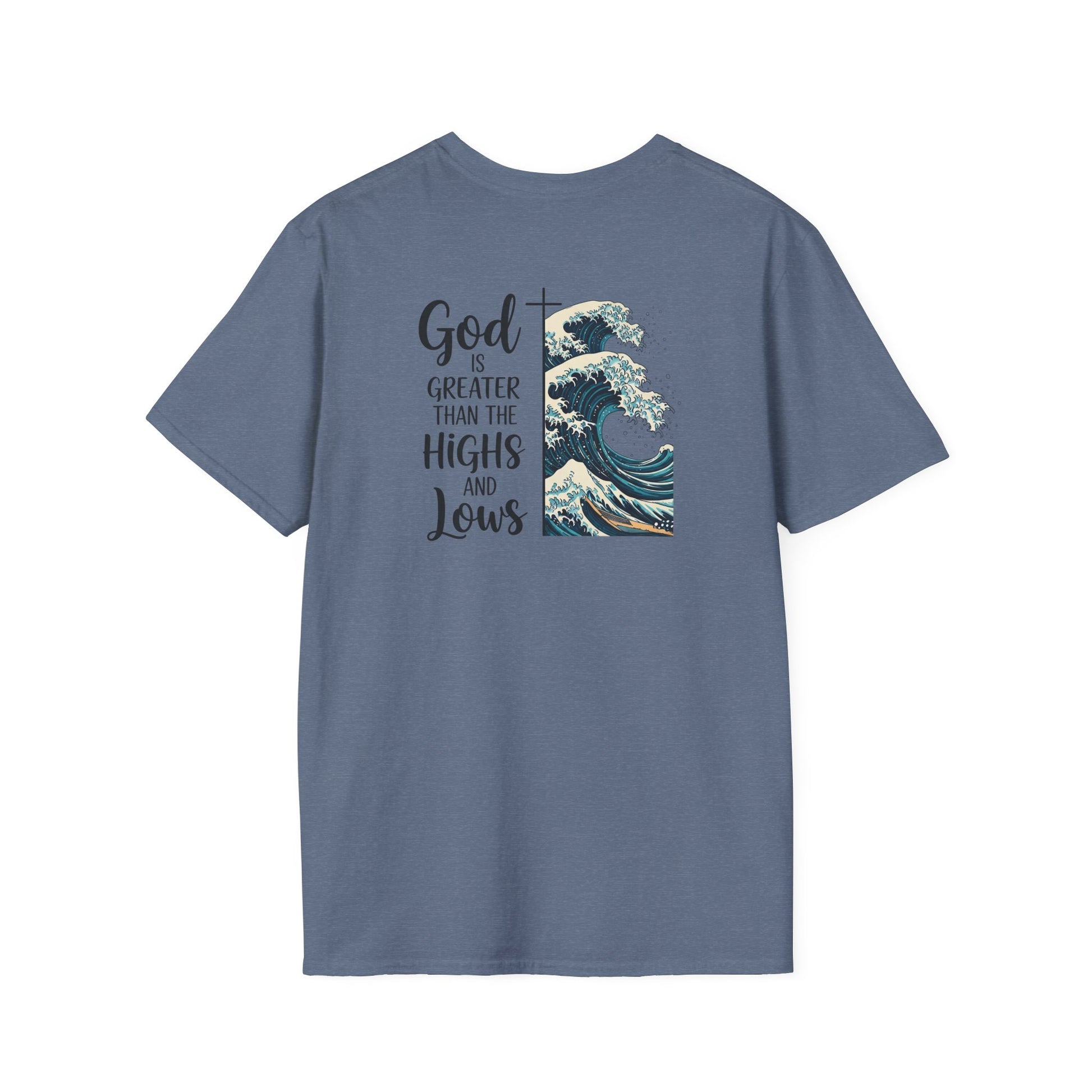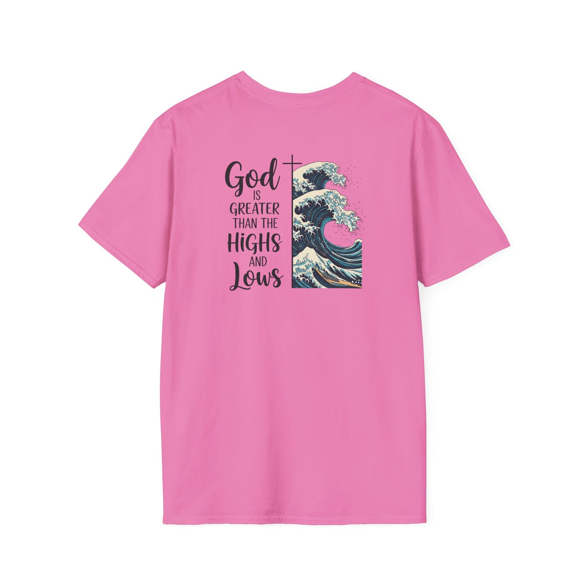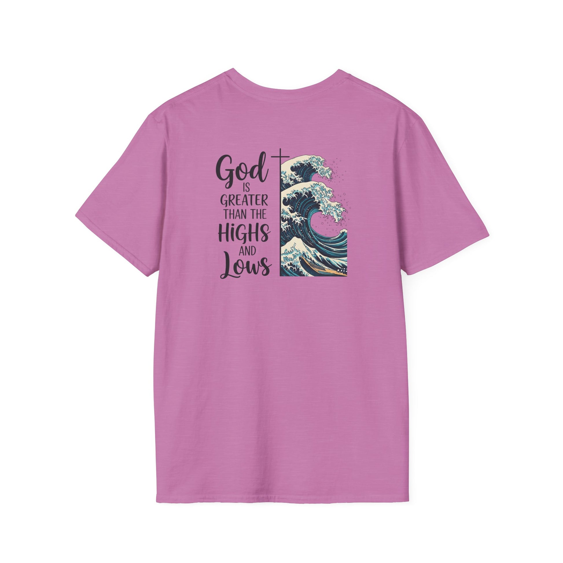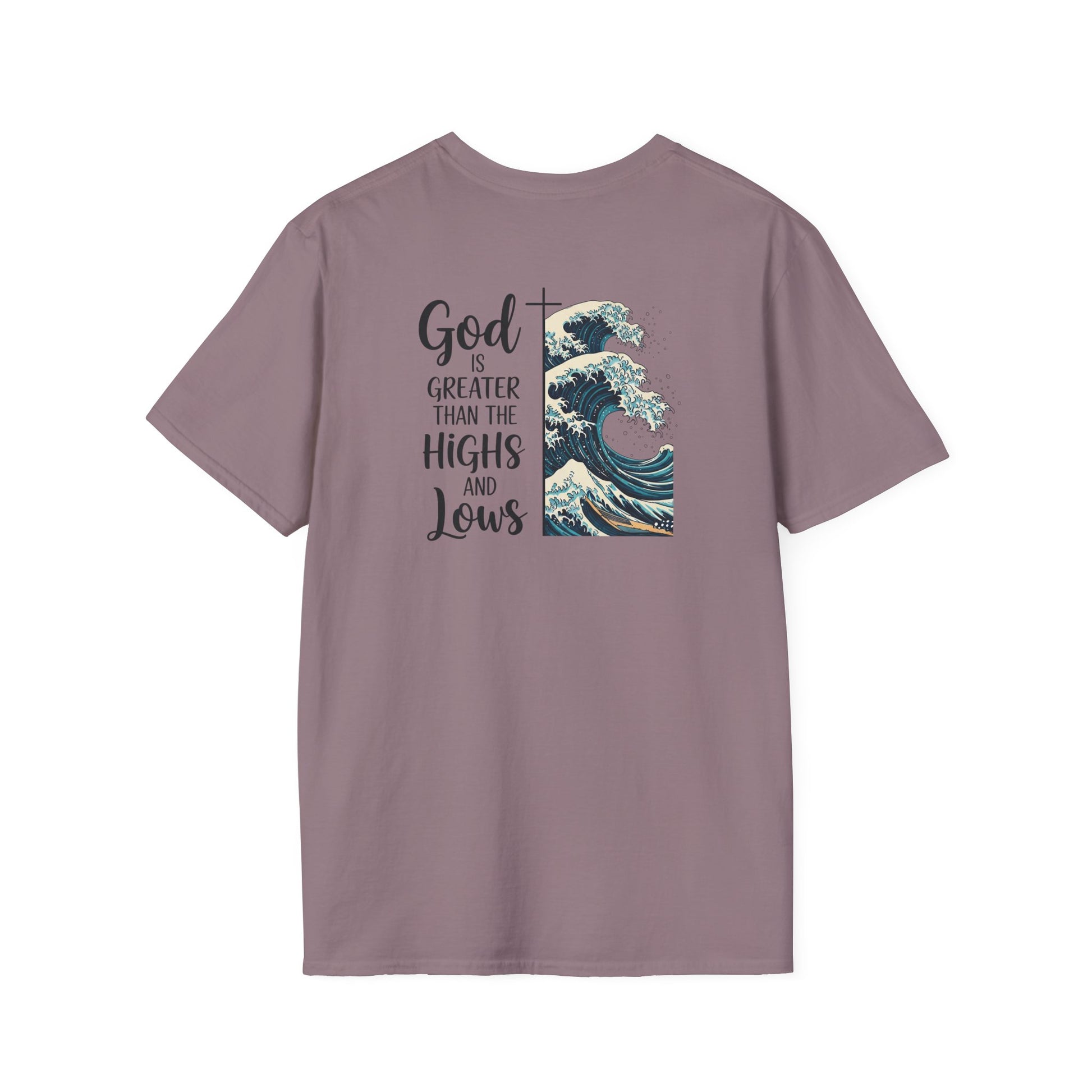 This stylish Unisex Softstyle T-Shirt offers a perfect blend of comfort, durability, and style. Crafted from exceptionally soft ring-spun cotton, it provides a blissful wearing experience any time of the year. With a classic fit and crew neckline, it adapts effortlessly to both casual and semi-formal occasions, making it a versatile addition to anyone's wardrobe. The print, featuring the inspiring message 'God is greater than the highs and lows,' adds a touch of positivity to your ensemble. Ideal for those who appreciate motivational quotes and wish to express their faith, this t-shirt makes a thoughtful gift for friends, family, or even as a personal reminder. Perfect for celebrations, special occasions, or just everyday wear, it suits anyone looking to uplift their spirit while showcasing their personal style.